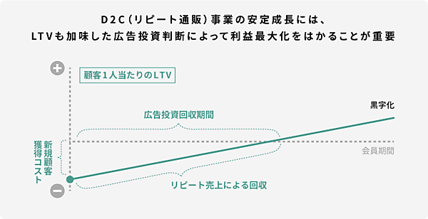 D2Cは、新規顧客獲得時にかける広告投資費用をリピート売上の利益で回収するビジネスモデル。新規顧客獲得時のCPA(顧客獲得単価)だけではなく、LTVも加味した広告投資判断で利益を最大化するが、広告施策のLTVが黒字になり一定の利益が出るまでの期間を算出するには、リピート購入を含めた受注データが1年から3年分必要になっていた。このため、広告投資判断を迅速に実施できる環境を実現するLTV予測機能を開発した。