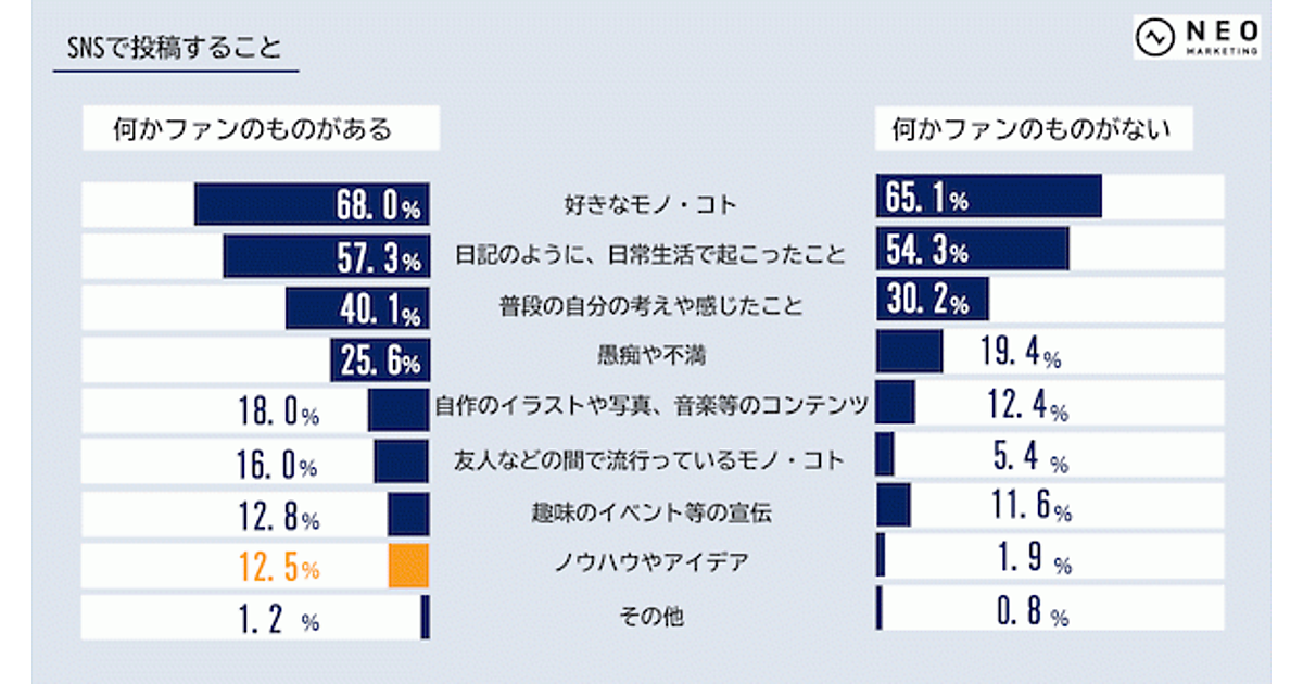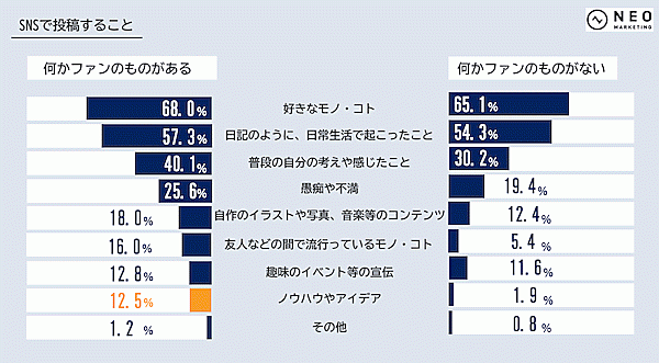 一方「SNSで投稿すること」を聞くと、ファンがある人・ない人ともに「好きなモノ・コト」68.0%・65.1%、「日常生活で起こったこと」57.3%・54.3%、「普段の自分の考え」40.1%・30.2%が上位だった。ただし順位は下位だが、「ノウハウやアイデア」の投稿率が、ファンのある人は12.5%にのぼる一方、ない人は1.9%に留まった。