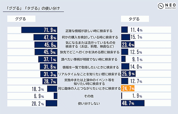 また普段のSNSの使い方を探るため、「ググる」(Google等で検索すること)、「タグる」(SNSでハッシュタグ検索すること)などの行為を、どういったときに行うかを聞くと、「ググる」では「正確な情報が欲しい」71.9%が最多、「タグる」は「リアルタイムなことを知りたい」25.9%が最多だった。調べる事柄・やりたいアクションがある程度決まっているときにググる、今現在の動向・同じ趣味の人を探したいときにタグるという使い分けのようだ。