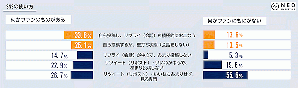 ここから「何かファンのものがある」人と「何かファンのものがない」人とで、比較を行った。まず「SNSの使い方」について聞くと、ファンのものがある人は「自ら投稿する」割合(リプライも積極的に行う+壁打ち状態の合計)が58.9%だったが、ファンのものがない人は27.1%と大きく差が出た。