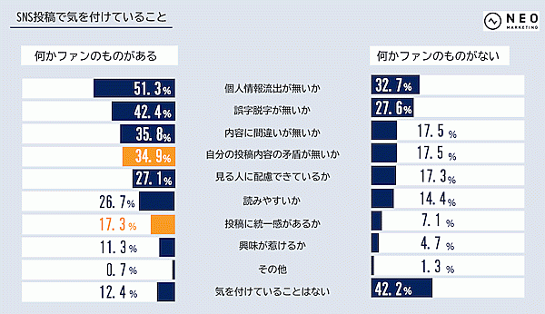 「SNSで投稿する際に気を付けていること」を聞くと、「個人情報流出がないか」51.3%・32.7%、「誤字脱字がないか」42.4%・27.6%、「内容に間違いが無いか」35.8%・17.5%と、こちらも上位の順位に差はなかった。ただし比率にはかなりの差があり、ファンのメーカーやブランドがある人ほど、注意深く振る舞っていることがわかる。とくに、「自分の投稿内容の矛盾がないか」「投稿に統一感があるか」など、自身の発言の一貫性など、“自己ブランディング”にかかわる項目では、倍近い差が出ている。
