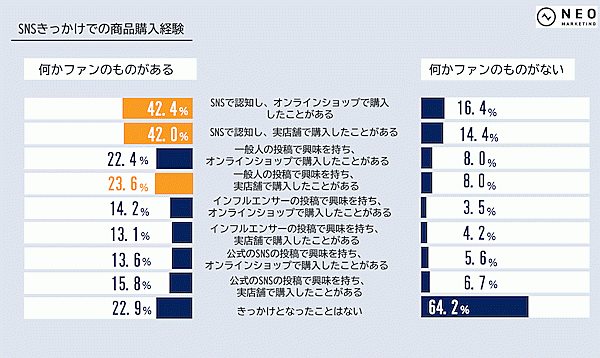 さらに「SNSきっかけで商品を購入したことがあるか」を聞くと、ファンがある人・ない人ともに「SNSで認知し、オンラインショップで購入したことがある」が最多だったが、42.4%・16.4%と大きな差が出た。一般人、インフルエンサー、公式SNSの投稿など、いずれもファンがある人のほうがアンテナ高く情報収集している様子がうかがえる。
