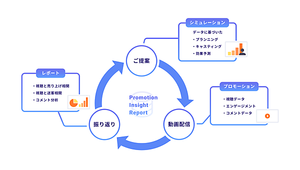 Promotion Insight Reportでプロモーションの配信データを多角的に分析し、動画の視聴回数・評価数・コメント数などの実績と、商品売上の数や金額、商品ページへの送客数などの相関関係を可視化する。具体的には①動画の実績と売上成果の相関関係の可視化・分析②自社内と同業種の他の複数プロモーション比較・相関関係の可視化・分析③データ分析に基づいたプランニングと実施前の成果予測をシミュレーション――を提供する。