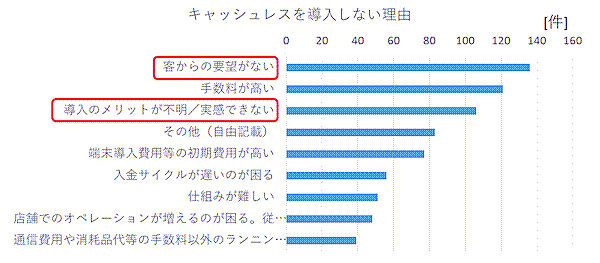 最後に「キャッシュレス決済の未導入理由」を聞くと、「顧客からの要望がない」「手数料が高い」「導入のメリットが不明」が上位だった。自由意見では「業態に合わない」「高齢者が多く要望がない」「銀行振込を利用」などの回答も多くあがっている。