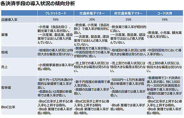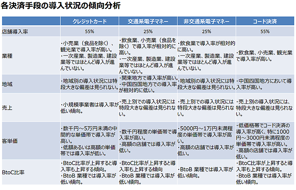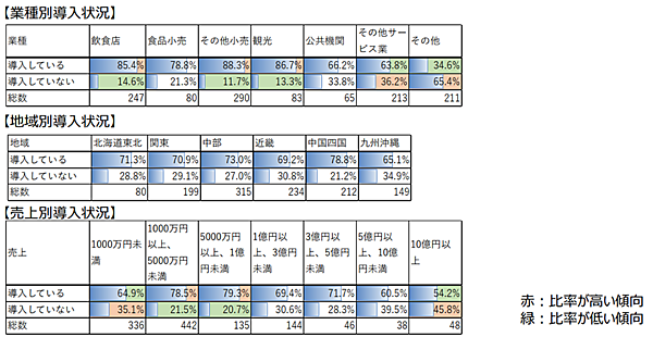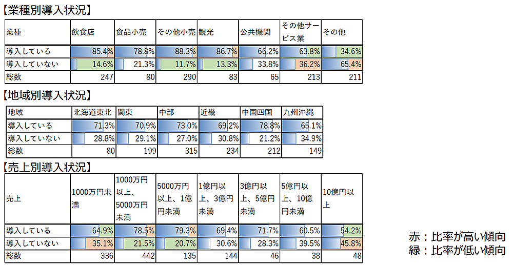 業種別では、飲食業・小売業・観光業が高い一方、公共機関、その他サービス業などはやや下がる。BtoB中心の一次産業、製造業、建設業、卸売業はほとんど進展がないという。店舗の売上規模との相関では、中規模事業者ではキャッシュレス決済の導入率が高い一方で、小規模/大規模事業者で低い傾向が見られた。