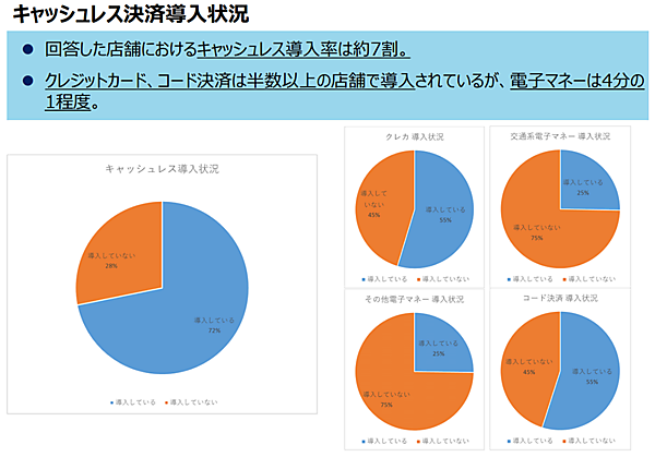それによると、キャッシュレス決済の導入率は72%。形態別ではクレジットカード、コード決済が55%で半数を超えたが、交通系電子マネー、その他電子マネーは25%に留まった。