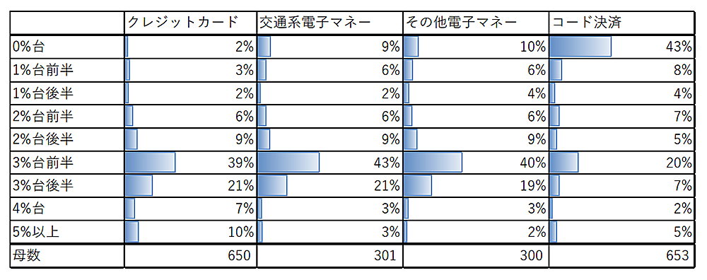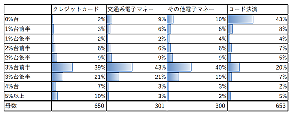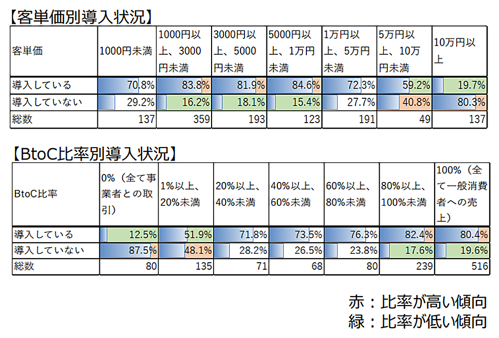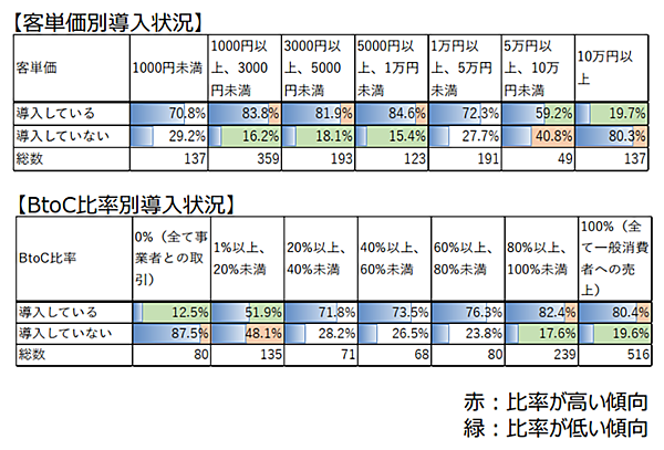 客単価別では、1000円~1万円未満の単価帯でキャッシュレス導入率が高い一方、客単価の高い店舗では導入率が低かった。