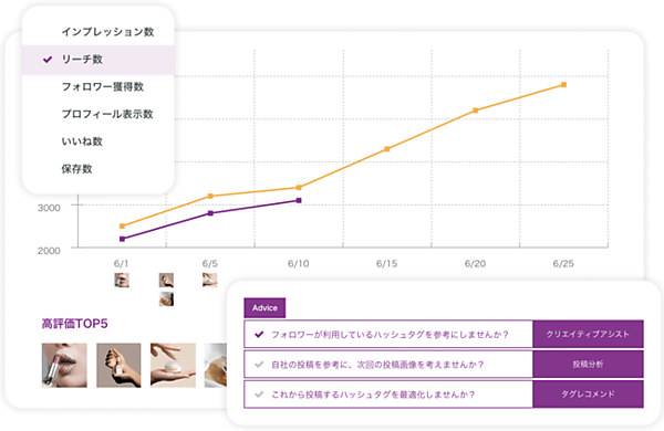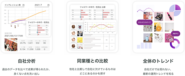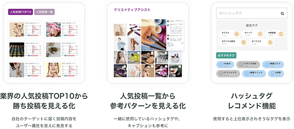 また、人気投稿に掲載されやすい投稿や、どのハッシュタグを使用すべきかのレコメンド機能を投稿に活用することができる。Instagramマーケティングは複雑で難易度が高いが、他社に委託せず自社内運用を目指す企業が増えていることから、運用ノウハウをサポートして内製化を支援するツールを提供する。ユーザーのインサイトとInstagramのトレンドを考慮した投稿で、ユーザーへ響く投稿を正確に届ける運用ができる。