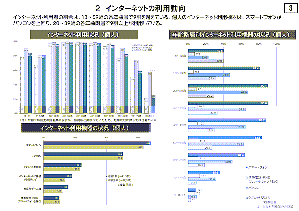 - 個人のインターネット利用機器は、引き続きスマホがパソコンを上回り、20~39歳では9割超に達する。