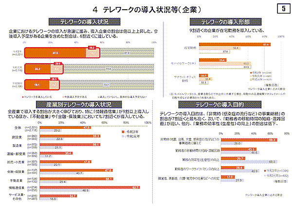 - テレワークが急拡大し、導入企業は47.5%に達した。これは前年比で倍以上となっている。