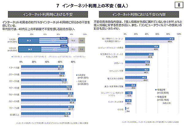 一方で、前年75.0%より微減したが、74.2%の人が「インターネット利用に何らかの不安を感じる」としており、高止まりの状態だ。年代別では、若いほど不安感が薄れ、10代では6割超に留まる。不安の具体的な内容では、「個人情報やインターネット利用情報の漏えい」が、前年より増加し91.6%と、9割台に達した。「コンピュータウイルスへの感染」63.4%がそれに続く。一方「電子決済の信頼性」への不安は、サービスが普及したことなどから前年よりやや下がり40.5%に留まった。
