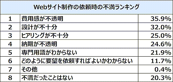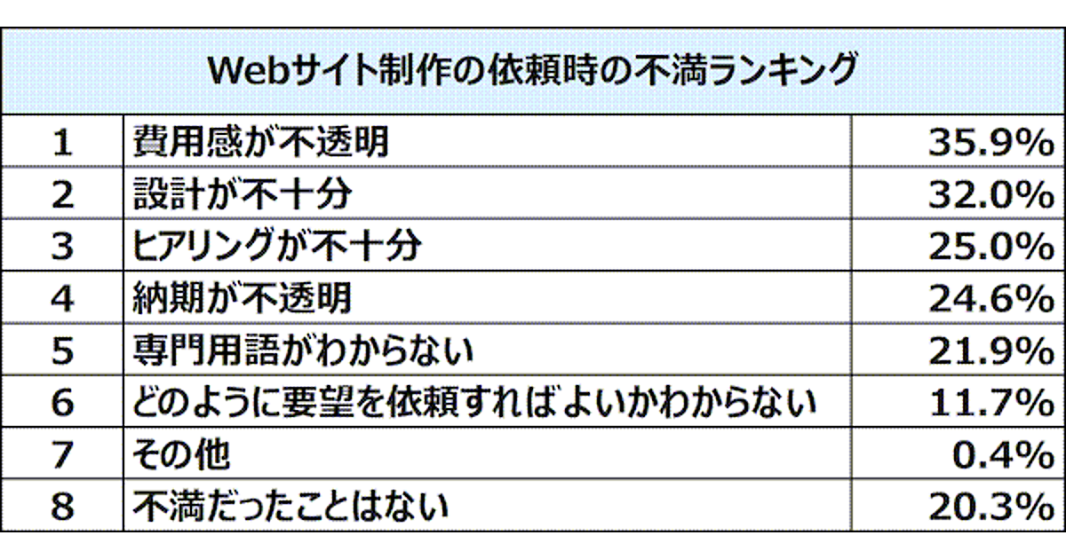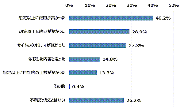 一方「Webサイト制作依頼時の不満」では、「費用感が不透明」35.9%で最多、続いて「設計が不十分」32.0%、「ヒアリングが不十分」25.0%だった。「Webサイト制作完了後の不満」では、「想定以上に費用が高かった」40.2%が最多だった。