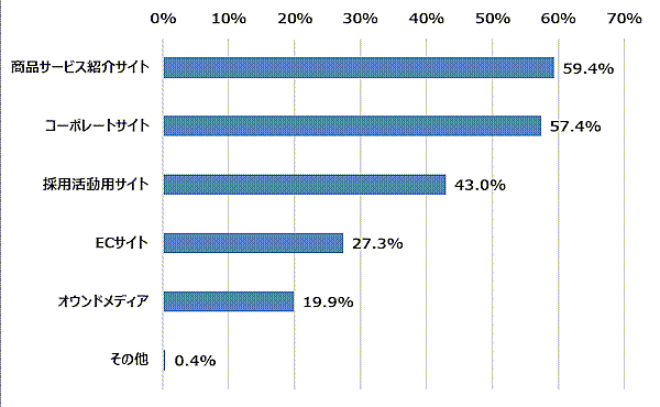 「外部に制作を依頼した自社のWebサイトの種類」では、「商品サービス紹介サイト」59.4%が最多。以下「コーポレートサイト」57.4%、「採用活動用サイト」43.0%が上位となった(サイト制作に携わったことがあり、外部に制作依頼をした256人が回答)。