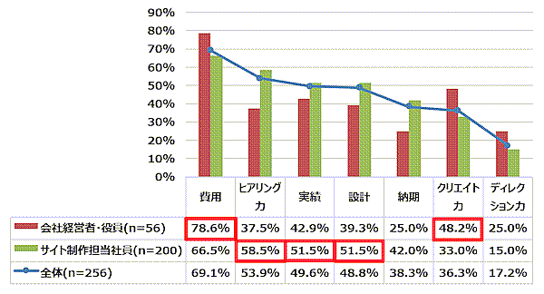 「Webサイト制作の依頼先を決定した理由」では、「費用」69.1%、2位「ヒアリング力」53.9%、3位「実績」49.6%、4位「設計」48.8%が上位となった。役職付きと担当社員で比較すると、「クリエイト力」について会社経営者・役員が48.2%、サイト制作担当者が33.0%と、意外にも役職付ほどクリエイティビティを重視していた。サイト制作担当社員では、「ヒアリング力」58.5%、「実績」「設計」51.5%などが、役職付より高かった。