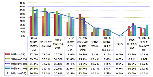 最後に全体に、「他社のコーポレートサイトについて、サイトを見るのをやめたポイント」を聞いてみると、「欲しい情報が見つからない」34.8%、「コンテンツがつまらない」33.0%、「情報が更新されていない」30.8%が上位だった。特に20代と30代以上で見ると、20代は「読み込みが遅い」「情報が更新されていない」と離脱する傾向が高い。