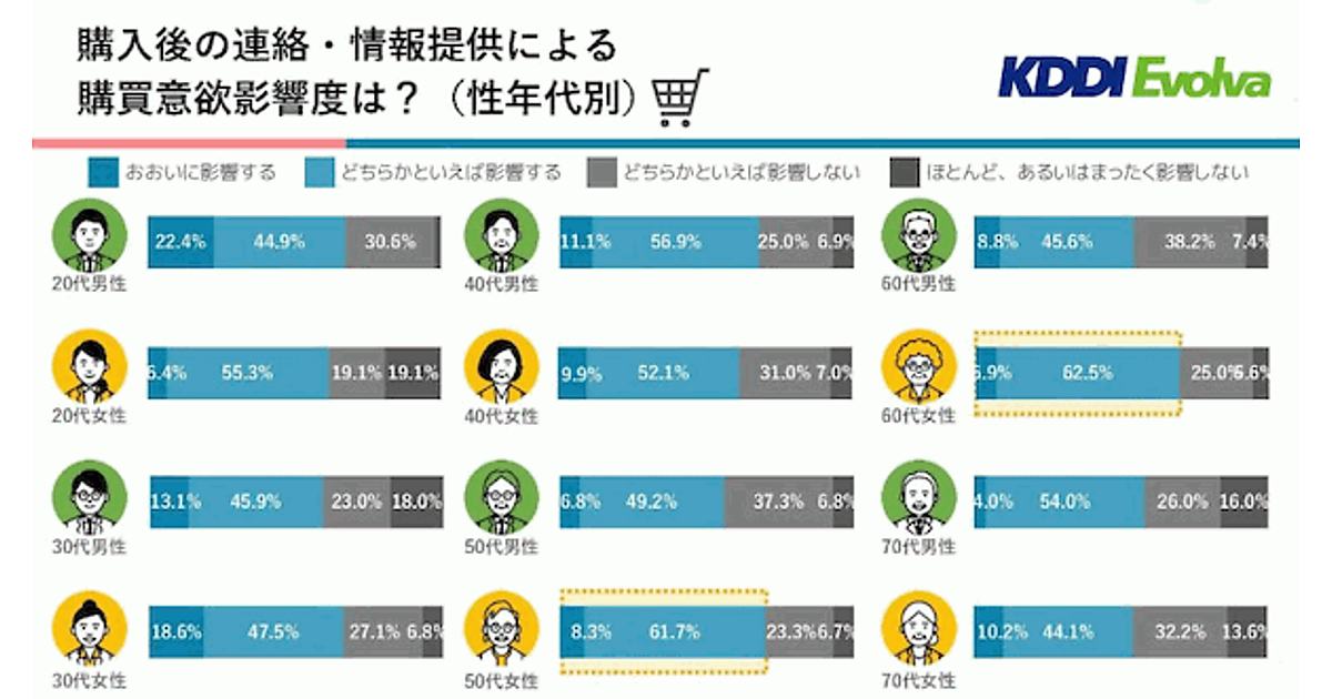 一方、購入後の企業からのフォロー連絡やセール情報の提供などの「企業からのアプローチ」が、他商品や次回購入時の意欲に影響する度合いは、ほぼすべての性年代で6割を超えた。ただし、20代女性・30代男性の18%が「まったく影響しない」とする一方、20代男性の22%が「おおいに影響する」と回答するなど、性年代別でもかなりの傾向差が見られた。