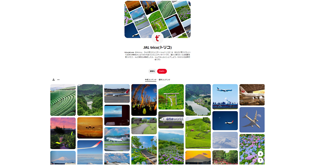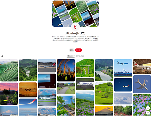 マーケティング支援事業のイーライフは、同社が運営を支援する日本航空(JAL)の旅コミュニティ「trico(トリコ)」が、画像共有SNSの「Pinterest(ピンタレスト)」の公式アカウントを開設した、と7月7日に発表した。trico会員がコミュニティサイトに投稿した旅のコンテンツを「目で楽しむUGC(ユーザー生成コンテンツ)」として幅広く楽しんでもらおうと開設した。