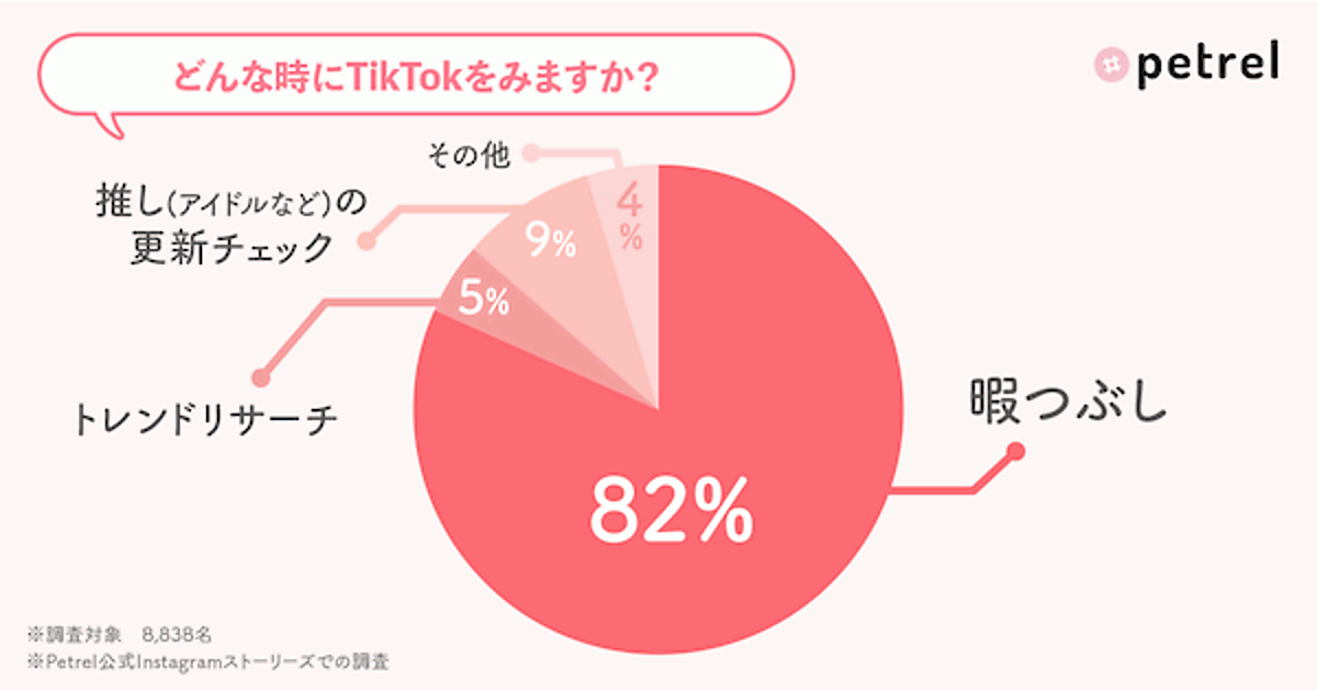 続いて「どんなときにTikTokを見るのか」「どんなときにリールを見るのか」をそれぞれ聞くと、ともに1位は「暇つぶし」が1位だが、TikTokは82%、リールは64%とかなりの差が出た。2位の「トレンドサーチ」を見ると、TikTokは5%に留まるのに対し、リールは16%と3倍近い。流し見が中心のTikTokに対し、情報を調べるツールとしても使われるInstagramという差が出たと思われる。