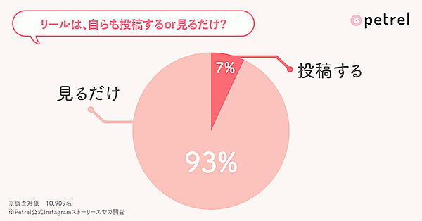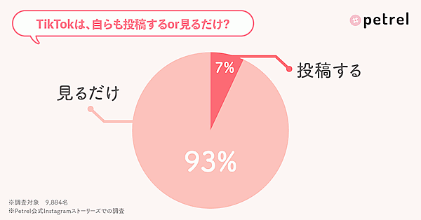 さらに「自分もTikTokに投稿するか」「自分もリールに投稿するか」をそれぞれ聞くと、TikTokは「投稿をせずに見ているだけ」と回答した人が93%。そして、リールも「投稿をせずに見ているだけ」と回答した人が93%とまったく同じだった。