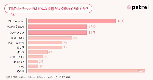 TikTok・リール双方において「どんな投稿がよく流れてきますか?」と聞くと、もっとも多かった回答は「推し(アイドルなど)」18%が1位だった。さらに「カフェ・おうちカフェ」12%、「ファッション」12%が上位にあがっている。