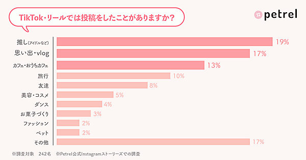 さらにTikTok・リール双方において「どんな投稿をしたことがありますか?」と聞くと、こちらでも1位は「推し」19%だった。僅差で「思い出・vlog」17%、「カフェ・おうちカフェ」13%が続く。日常の手軽な記録ツールとして、やはりInstagramやTikTokが使われているようだ。