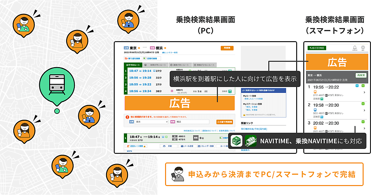 経路探索エンジン開発とナビゲーション事業のナビタイムジャパンは、ローカルビジネス向けマーケティングプラットフォーム「NAVITIME Market Place」で「駅ターゲティング広告」の提供を7月8日から始めた、と同日発表した。総合ナビゲーションサービス「NAVITIME」などで、広告主が指定した駅を到着駅にして検索したユーザーの検索結果上に広告を表示でき、申し込みから決済までPC・スマートフォンで完結する。