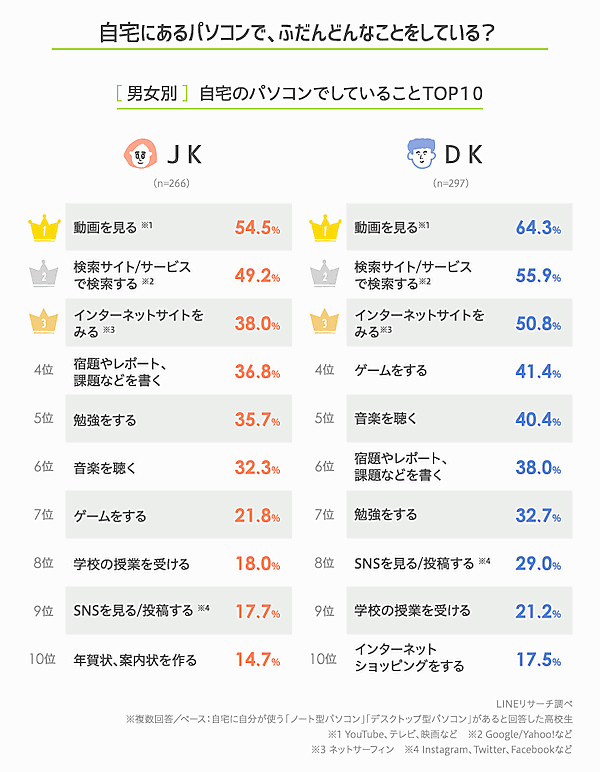 LINEの調査サービス「LINEリサーチ」では、「高校生がふだんパソコンで何をしているか」について調査した結果を発表した(有効回収数:5,252サンプル)。