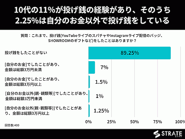 10代の投げ銭経験者10%ほど、ただし「親・親類のお金を使って投げ銭」との回答も