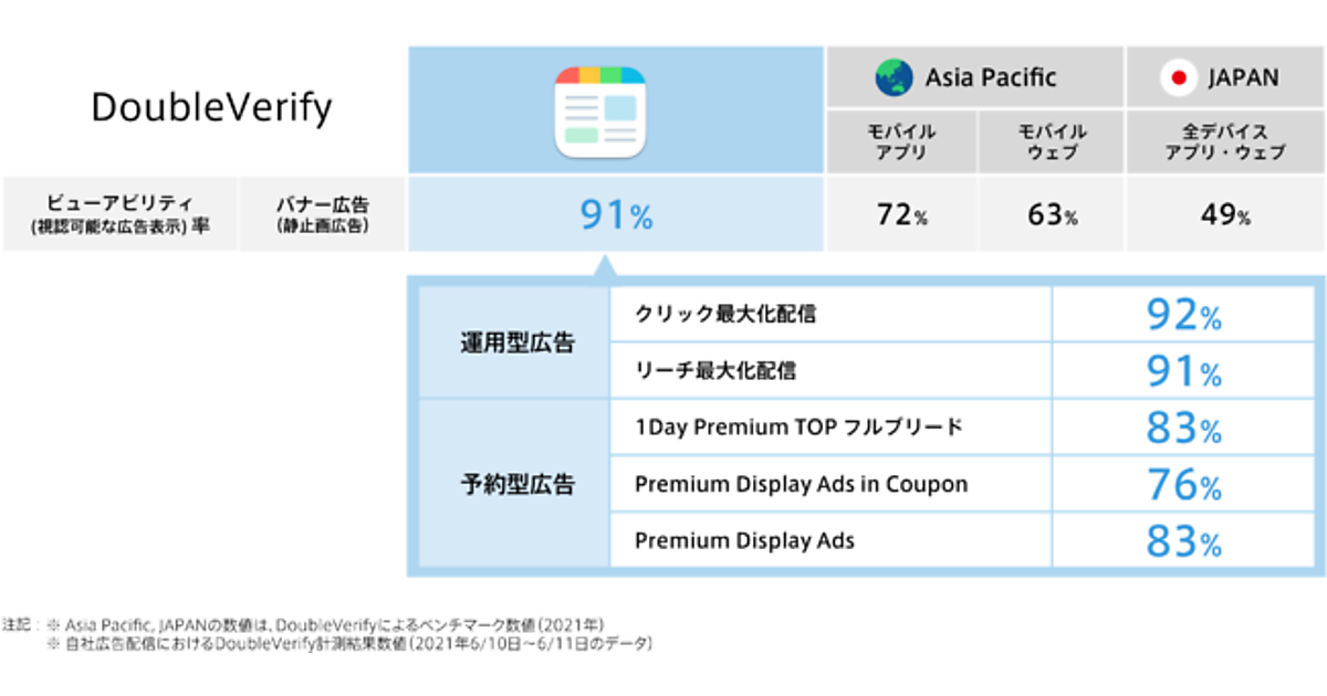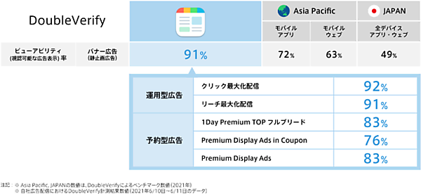 DoubleVerifyと契約している広告主は、SmartNews Adsのバナー広告(静止画)でビューアビリティ、アドフラウド、ブランドセーフティなどの広告品質指標レポートが提供され、正確に評価できるようになる。DoubleVerifyとの連携を受けてスマートニュースがSmartNews Adsのビューアブル率を計測したところ、日本やアジア太平洋の平均を上回る91%になった。