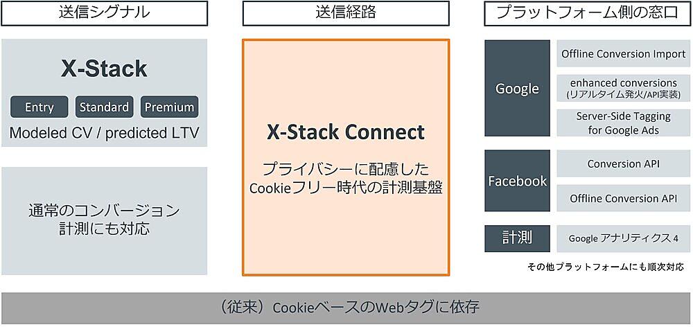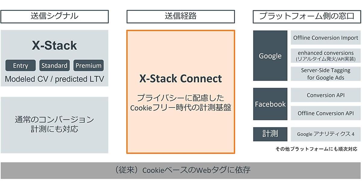 世界的なプライバシー保護の流れを受けてCookieの利用に制限がかかるようになり、ブラウザCookieに依存した計測が今後一層困難になっていくため開発した。同社が2018年10月から展開しているソリューション「X-Stack」を強化・拡充した。X-Stackは、予測LTV(顧客生涯価値)を指標に事業KPI(重要業績評価指標)を予測するモデルをデジタル広告運用に活用する。