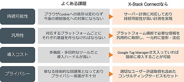 X-Stack Connectは、計測環境としての持続可能性▽汎用(はんよう)性の高い実装方式▽導入ハードルの低減▽プライバシー保護への配慮--の特長がある。持続可能性では、サーバー側のアクセスログとフォームの入力情報の両方を使う計測に対応し、Cookieに頼らない計測基盤を実現した。導入は、Googleのタグ管理ツール「Google Tag Manager」をサイトに設置し、そこからの情報をクラウド環境で処理する方式を採用することで容易にした。