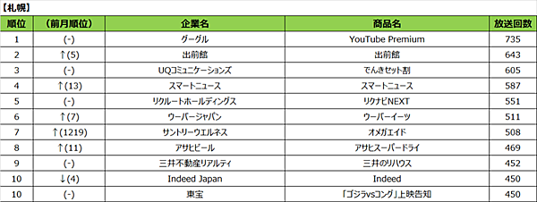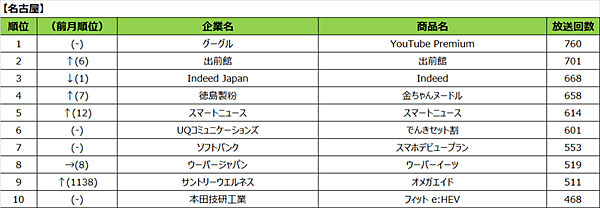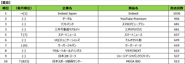 それによると、最もCM放送回数が多かった商品は、グーグル「YouTube Premium」3,827回だった。「広告なしで動画が楽しめる」点を訴求するCMを複数パターン用意し展開し、前月のトップ20圏外から一気にトップとなった。前月1位のIndeed Japan「Indeed」は3,136回で2位にランクダウン。3位にはスマートニュース「スマートニュース」3,008回が入り、Webサービスがトップ3を占めた。