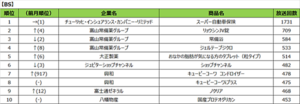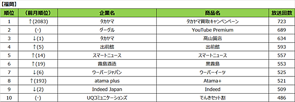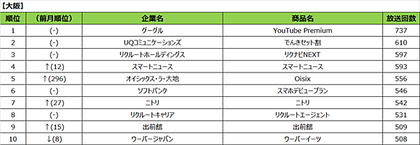 その他エリア別およびBSでのテレビCM放送回数ランキングは以下のとおり。東京では日本スポーツ振興センター「MEGA BIG」(前月823位→今月10位)、大阪ではオイシックス・ラ・大地「Oisix」(前月296位→今月5位)、名古屋と札幌でサントリー・ウエルネス「オメガエイド」、福岡ではタカヤマ「タカヤマ買い取りキャンペーン」(前月2083位→今月1位)などが急上昇した。