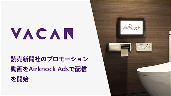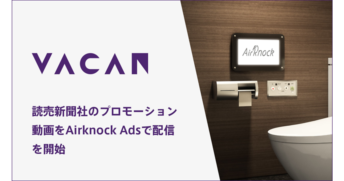 空席情報収集サービス事業のバカンは、同社が展開するトイレ個室長時間利用抑止IoT(モノのインターネット)サービス「VACAN AirKnock Ads(バカンエアーノックアッズ)」で、読売新聞東京本社のプロモーション動画の配信を7月16日に始めた、と同日発表した。トレイ内に設けた小型ディスプレーを通して動画を流す。同サービスを導入している商業施設で実施する。