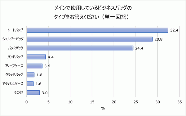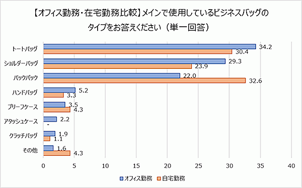 まず「ビジネスにおいて主に使用するバッグのタイプ」を聞くと、「トートバッグ」32.4%、「ショルダーバッグ」28.8%、「バックパック」24.4%がトップ3で、全体の8割近くを占めた。オフィス勤務者・自宅勤務者で比較すると、オフィス勤務者は「トートバッグ」34.2%を、在宅勤務者は「バックパック」32.6%を主に使用していた。