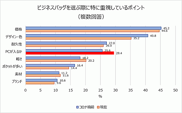 そこで「ビジネスバッグを選ぶ際に、特に重視しているポイント」をコロナ禍前・後でそれぞれ聞くと、1位はいずれも「価格」、2位は「デザイン・色」となった。一方3位は、コロナ禍前は「耐久性」27.0%、現在は「PCが入るか」29.3%に変化していた。テレワークの拡大により、PCを持ち歩く機会が増えたことで、ビジネスバッグに求める条件が変化したと考えられる。