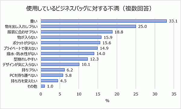 最後に「使用しているビジネスバッグに不満があるか」を聞くと、6割以上がなんらかの不満を感じていた。具体的に聞くと、「重い」33.1%、「物を出し入れしづらい」25.0%、「服装に合わせづらい」18.8%が上位にランクインしている。その他「ポケットが少ない」「撥水・防水性がない」といった意見も多かった。仕事スタイル、所有PCのサイズや重さ、さらには機能面・デザイン面で、バッグに何を求めるかは十人十色のようだ。