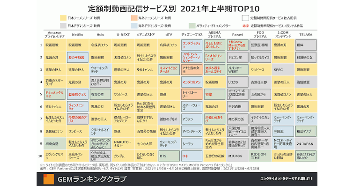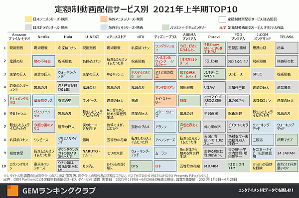 記載の実査日において過去1週間以内にそのタイトルを見た人の多さを示す「視聴者数ポイント」によると、Amazonプライム・ビデオ、Netflix、Hulu、U-NEXTなど、主要サービスの上位には、「呪術廻戦」「鬼滅の刃」「進撃の巨人」「名探偵コナン」など、日本のアニメシリーズ・映画(黄色)が多くランクインした。