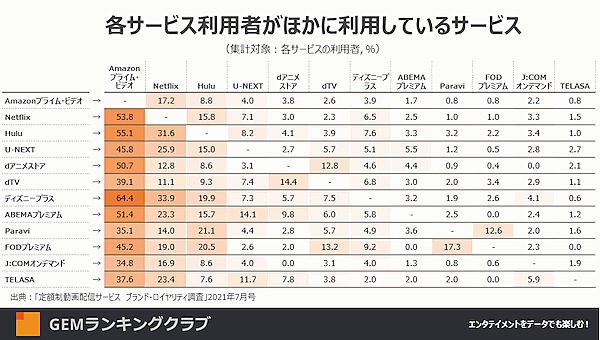 「そのサービスのみを利用している」という人の割合を見ると、「Amazonプライム・ビデオ」61.8%が最多だが、他サービスは3割程度まで下がるため、多くの利用者は複数サービスを併用していると考えられる。「各サービス利用者が他に利用しているサービス」を見ると、Amazonプライム・ビデオをメインで視聴し、その他サービスも併用している様子がうかがえる。