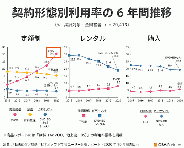 さらに動画配信サービスの3形態である「定額制」「レンタル」「購入」について、ここ数年の推移を見ると、「定額制(SVOD)」が昨年時点で30.3%と最多で、約2割のDVDレンタル・DVDセルを上回っていた。推移を見てもDVD系は右肩下がりであり、SVODの急成長が目立つ。売り切り型からサブスクリプション型のサービスが今後主流となり、かつ複数サービスの利用が前提というのが未来図と言えそうだ。