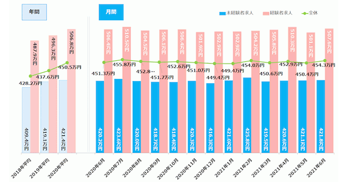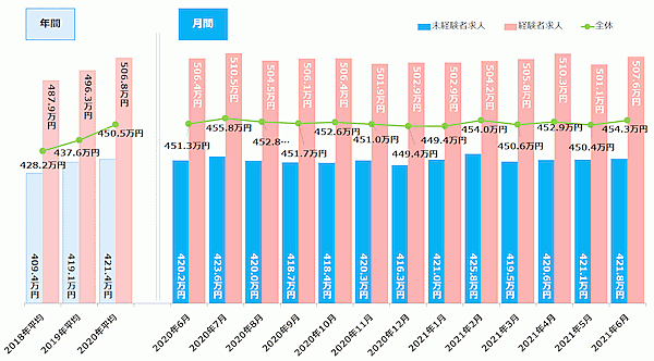 マイナビが運営する総合転職情報サイト「マイナビ転職」は、「2021年6月度 正社員の平均初年度年収推移レポート」を発表した。マイナビ転職に掲載された求人について、「平均初年度年収」を未経験・経験者求人別に集計している。