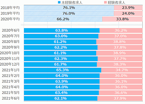 経験者・未経験者の求人割合を見ると、未経験者62.1%:経験者37.9%で、経験者募集がここ数か月増加を見せている。