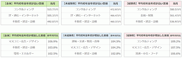 業種別の平均初年度年収では、「コンサルティング」がもっとも高く515.7万円。以下「IT・通信・インターネット」505.3万円、「不動産・建設・設備」492.0万円が続いた。