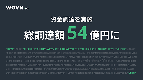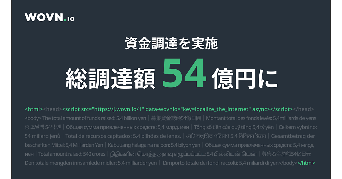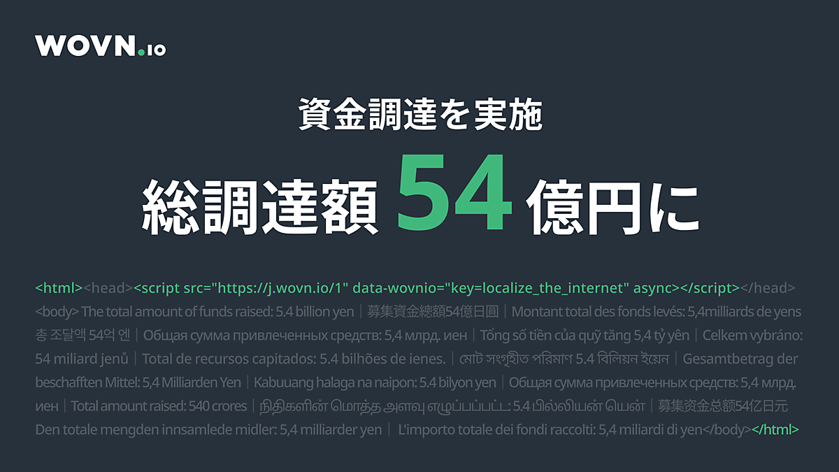 多言語・翻訳ソリューション開発のWovn Technologiesは、同社に出資する既存の投資家4社と、新規の投資家3社を引受先とする第三者割当増資で約36億円の資金調達を実施した、と7月28日に発表した。創業以来の累計調達額は約54億円になった。今回の資金調達ラウンドは、未上場・上場株式の双方を投資対象にしたクロスオーバーの海外機関投資家やESG(環境・社会・企業統治)投資家などを中心に行われた。