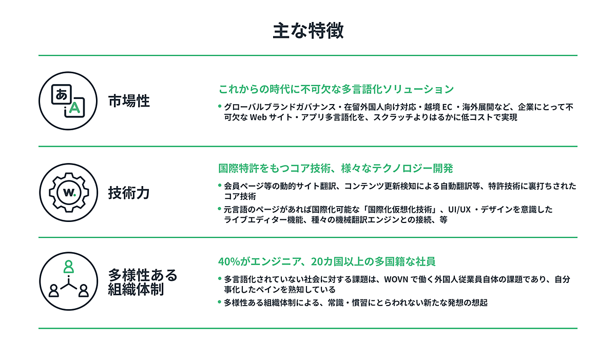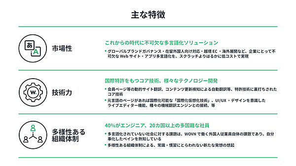 既存のWebサイトを後付けで多言語化する「WOVN.io(ウォーブン・ドットアイオー)」を提供するWovn Technologiesは、調達資金を社員の育成・スキル強化と採用強化▽イベントなどマーケティング・販促活動の強化▽Webサイト・アプリ多言語化以外の新規事業・新サービス開発――に投資する。WOVNの市場シェアを拡大し、国内外のエンタープライズ分野でインターネットを多言語化する機能・サービスをさらに強化する。