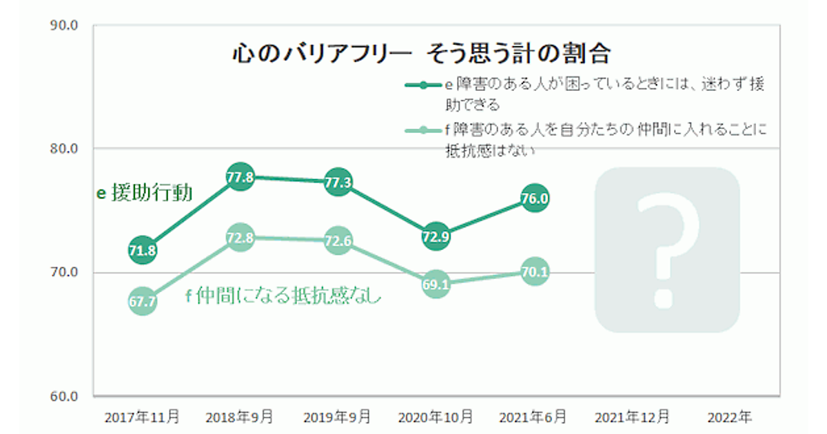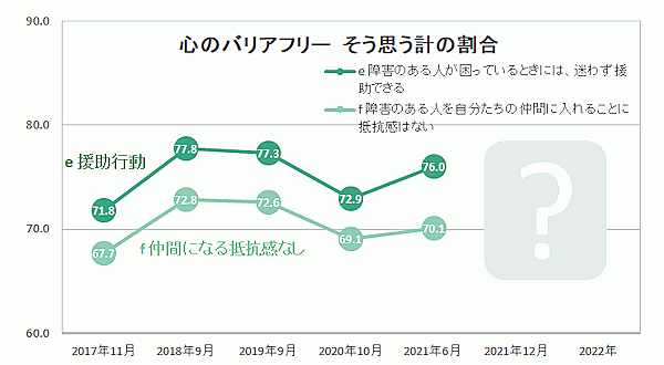 「心のバリアフリー」においては、「障害のある人が困っているときには、迷わず援助できる」76.0%、「障害のある人を自分たちの仲間に入れることに抵抗感はない」70.1%となり、ここ数年減少していたが、いずれも増加に転じている。