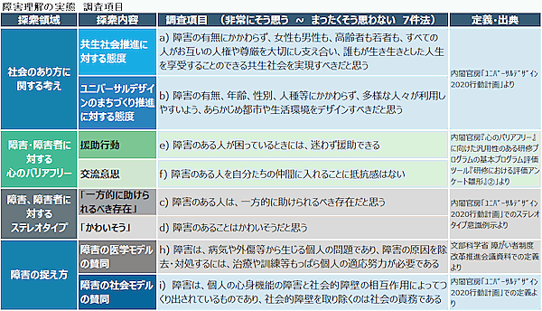 同社では2017年より毎年、ユニバーサルデザインに関する定点観測調査を行っており、今回で5回目。この調査では、「社会のあり方」「心のバリアフリー」「障害者に対するステレオタイプ」「障害の捉え方」の4つの観点から、障害を巡る考え方を質問している。