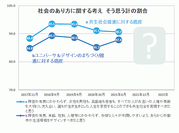 それによると、まず「社会のあり方」については、高水準ながら2018年をピークとしており「共生社会推進への賛同率」が微減する一方で、「ユニバーサルデザインのまちづくり推進への賛同率」が前年から大きく増加に復調した。