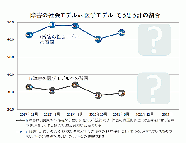 「障害の捉え方」について、医学モデル(障害は病気や外傷から生じる個人の問題)と社会モデル(障害は個人の心身機能の障害と、社会的障壁の双方で作られる問題)のいずれに賛同するかを聞くと、「社会モデルへの賛同」64.2%に対し「医学モデルへの賛同」は29.4%に留まった。