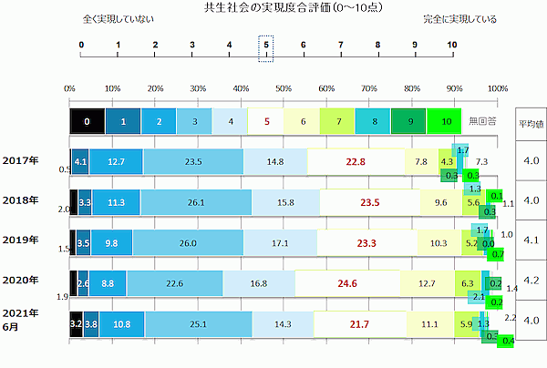 最後に「共生社会が実現しているか」を0点(まったく実現していない)~10点(完全に実現している)で評価してもらうと、2021年6月時点での評価平均値は4.0点。この値はここ数年4.0~4.2点ほどにとどまっており、共生社会の実現はまだまだと評価している人のほうが多いと考えられる。